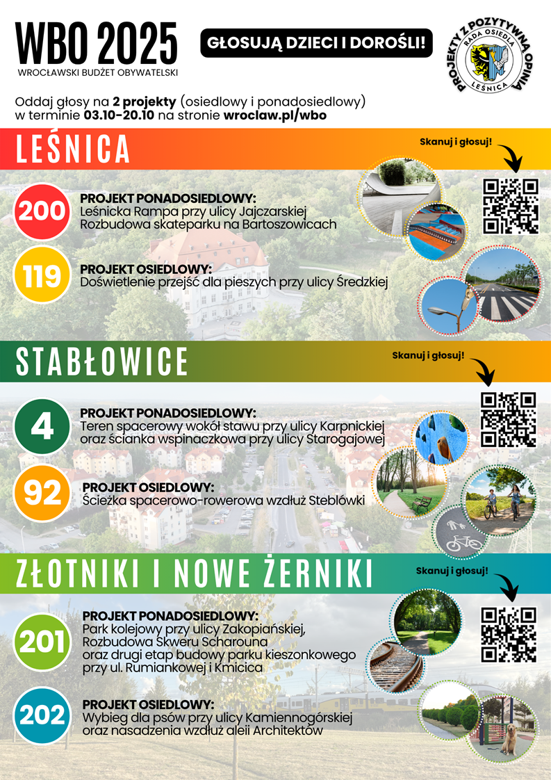 Zachęcamy Państwa do głosowania na projekty z naszego Osiedla, które uzyskały rekomendacje Rady Osiedla Leśnica.